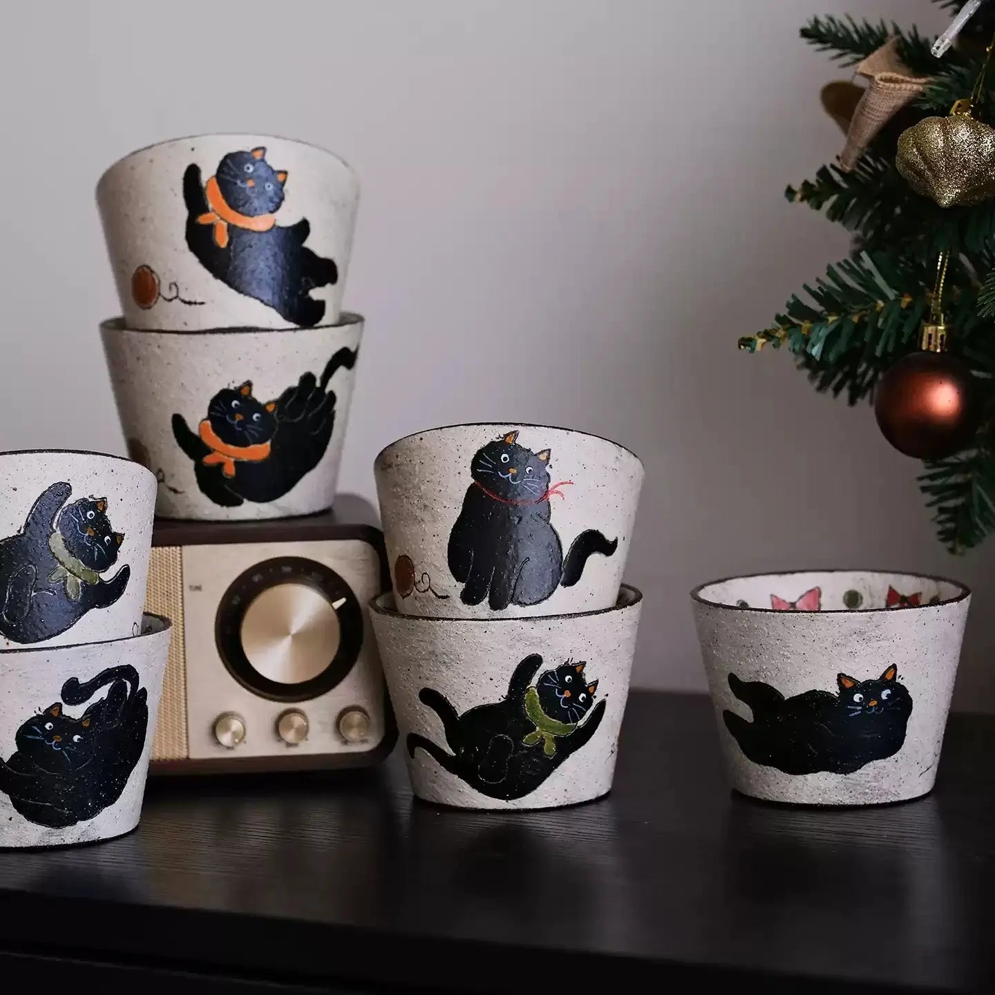 - Unique Cat Poses & Inner Rim Motifs: Each style features a different black cat gesture paired with a matching inner rim pattern (bows, flowers, apples, leaves).
