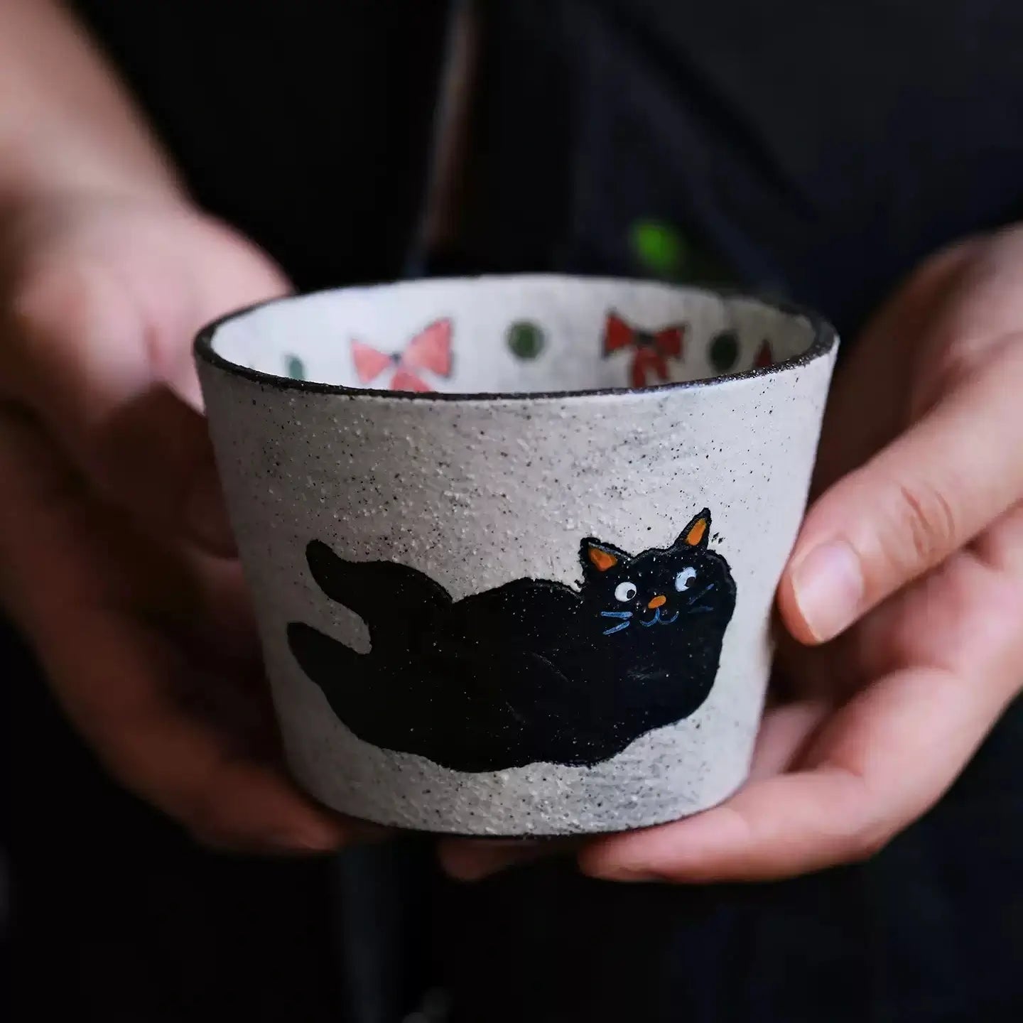 Bring home a little moment of quiet joy — a hand-thrown ceramic cup featuring a charming black cat painted in expressive, textured brushstrokes. Each cup is shaped, fired, and painted by hand, resulting in a tactile matte-sand surface and natural variations that echo true artisan pottery.