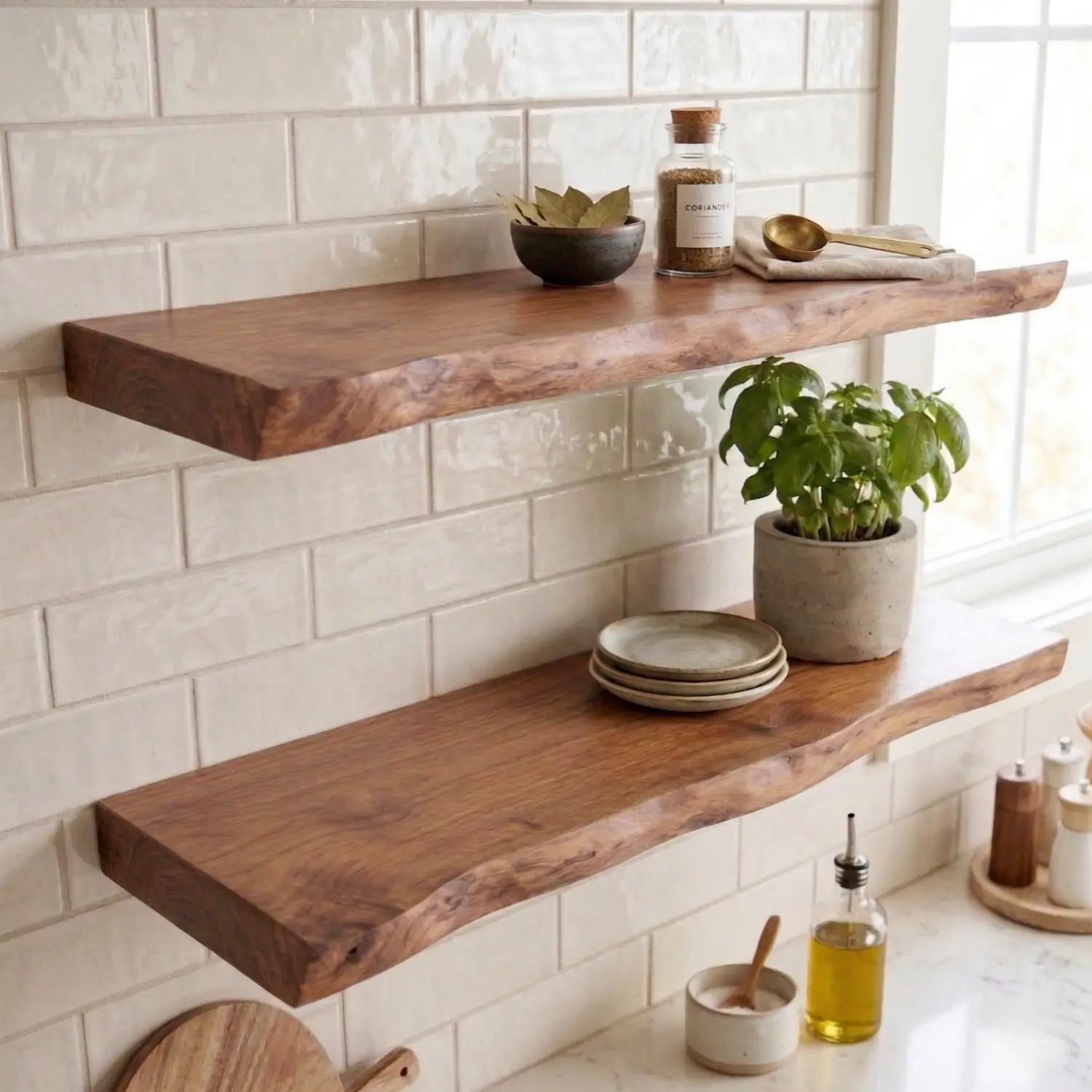 Each shelf features a naturally shaped front edge for an organic, handcrafted look. No two pieces are exactly alike.